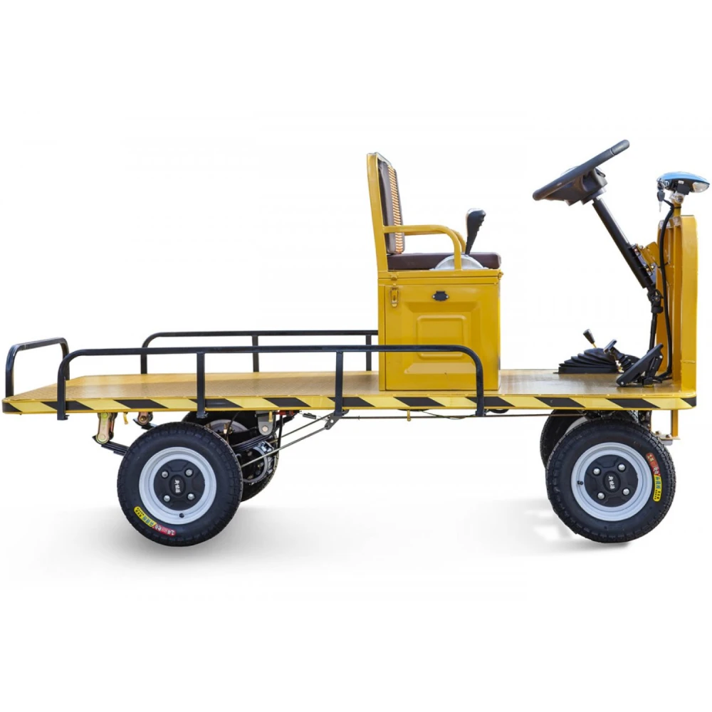 Платформа размерами 2100 x 1000 мм изготовлена к высокопрочной стали, рассчитана на продолжительную эксплуатацию без потери первоначальных характеристик при максимальных нагрузках до 1000 Вт. Электрокар оснащен мощным электродвижком на 1200 Вт способным развит скоростные параметры до 25 км/час. Накатистые колеса отлично сцепляются с поверхностью, способны преодолевать подъемы до 15 градусов.