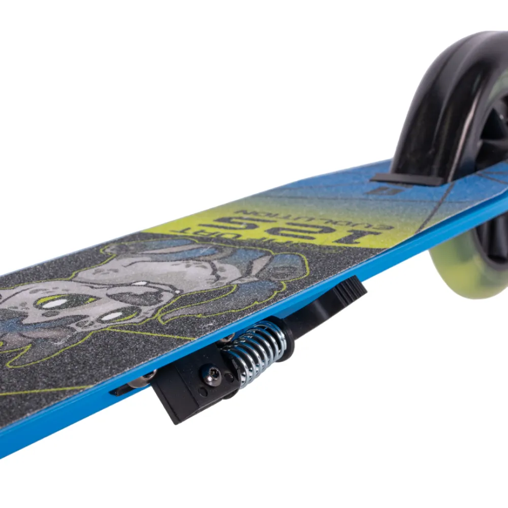 Колёса диаметром 125х24 мм из прозрачного полиуретана с подсветкой добавляют неповторимый стиль и делают катание заметным даже в темное время суток. Подшипники ABEC 7 гарантируют плавное и быстрое катание, а алюминиевая дека украшена изображением красивого волка, который наверняка привлечёт внимание сверстников.
