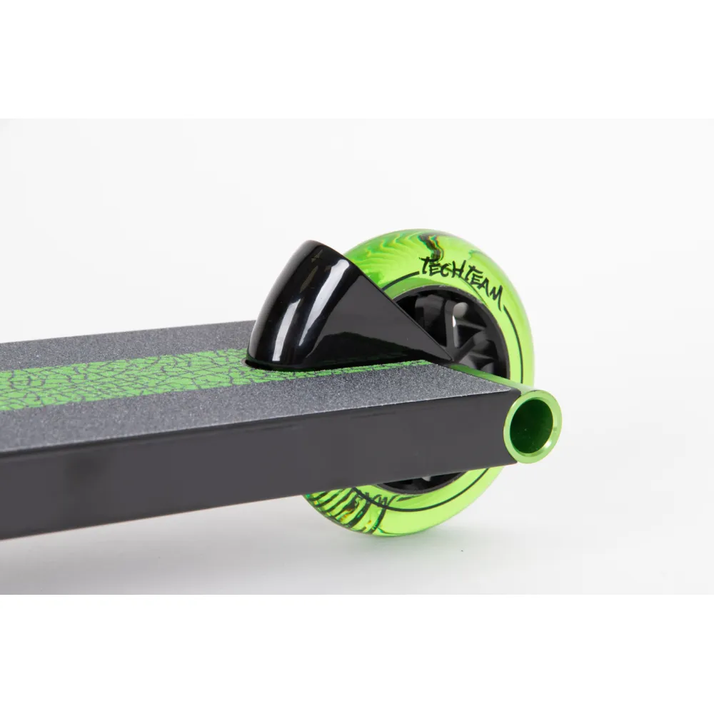 Отличительными деталями самоката является дека, передняя часть которой скошена и заварена. В качестве опоры для ноги и предотвращения случайного торможения служит стальной фендер.